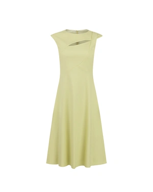 Stylish women's dress with a clean silhouette, suitable for office looks. The model comes in a fresh spring tone - pastel pistachio. It features a round neckline, cap sleeves, a fitted bodice and flared skirt with a decorative cutout at the neckline; can be combined with a jacket from the collection.